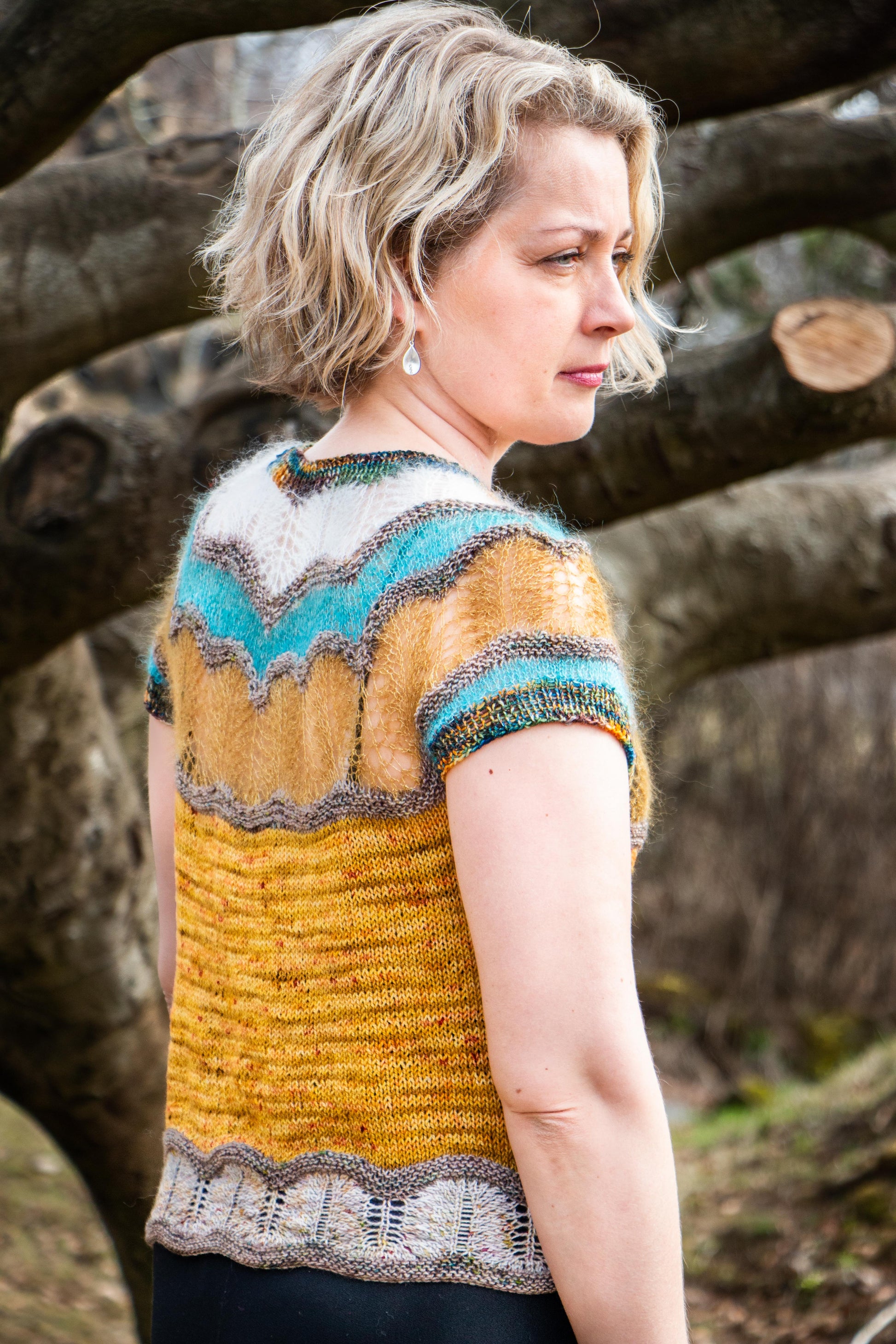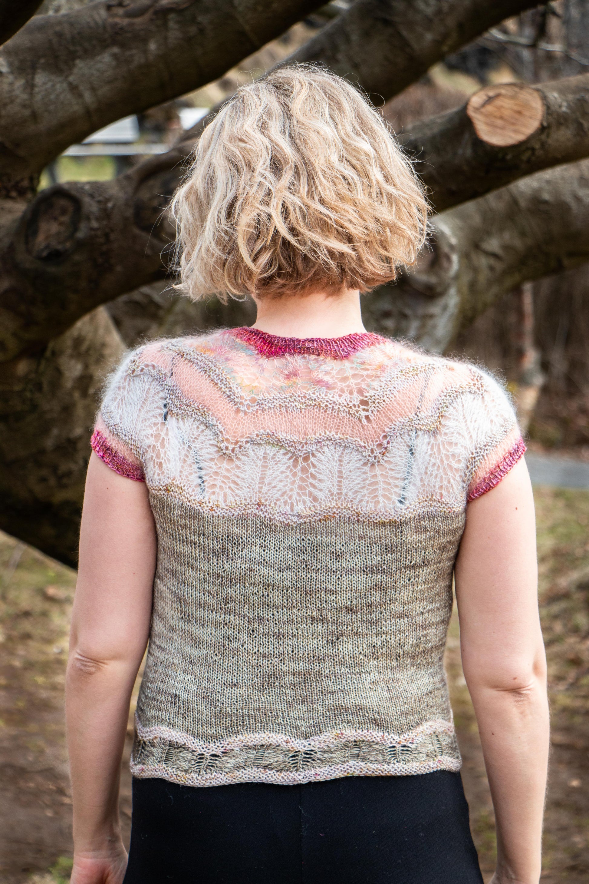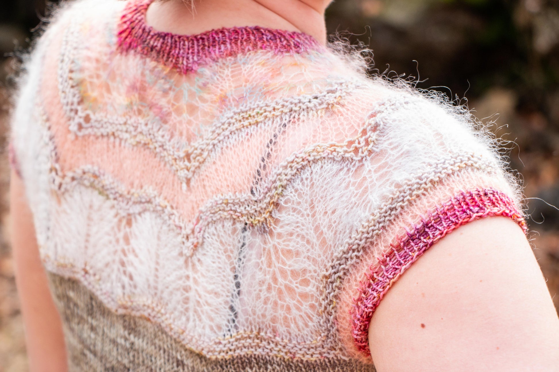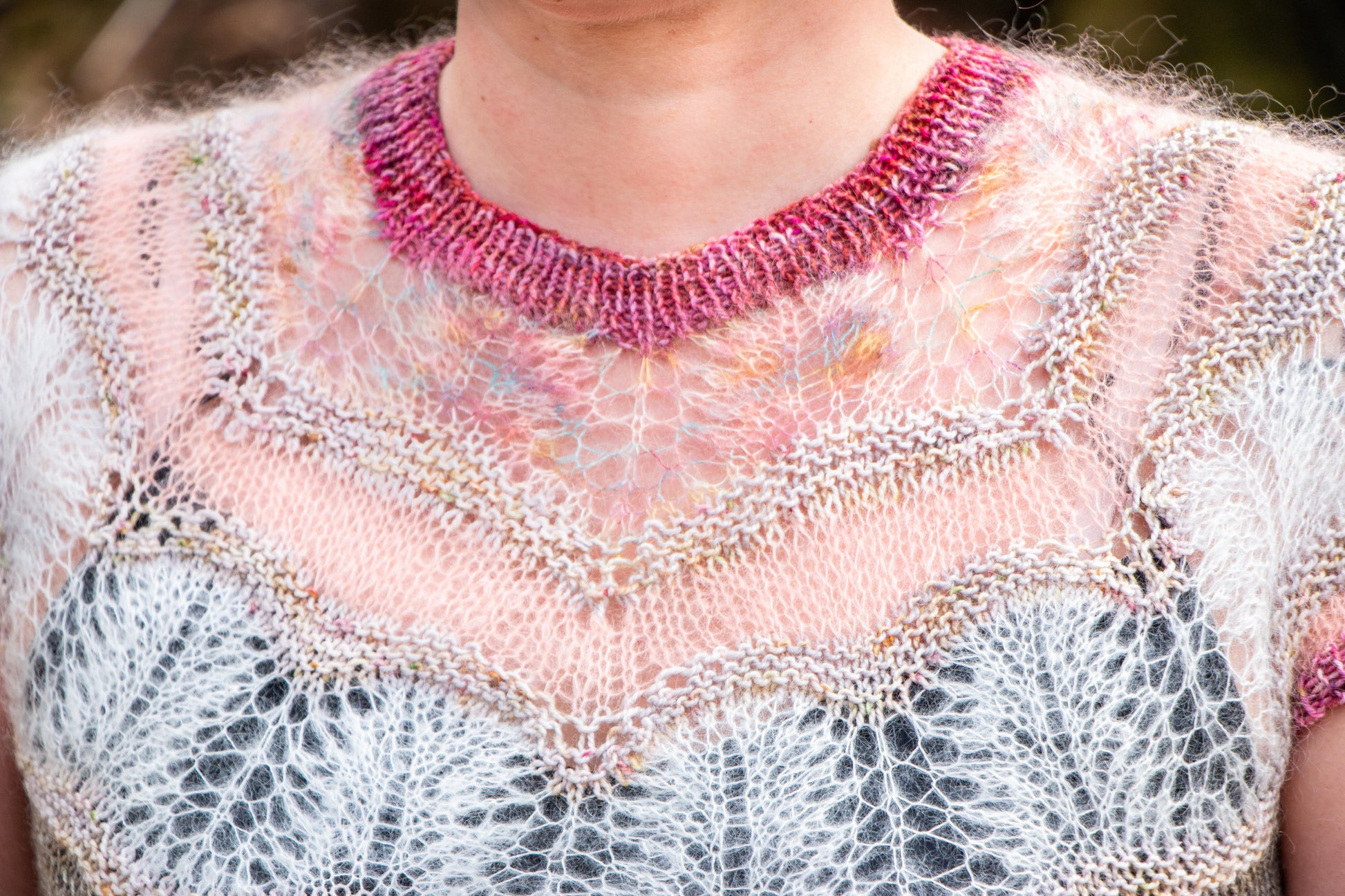A light and lovely sweater knit from the top down. A perfect project for stash busting, as you can use leftovers for most of the sections, if not all.